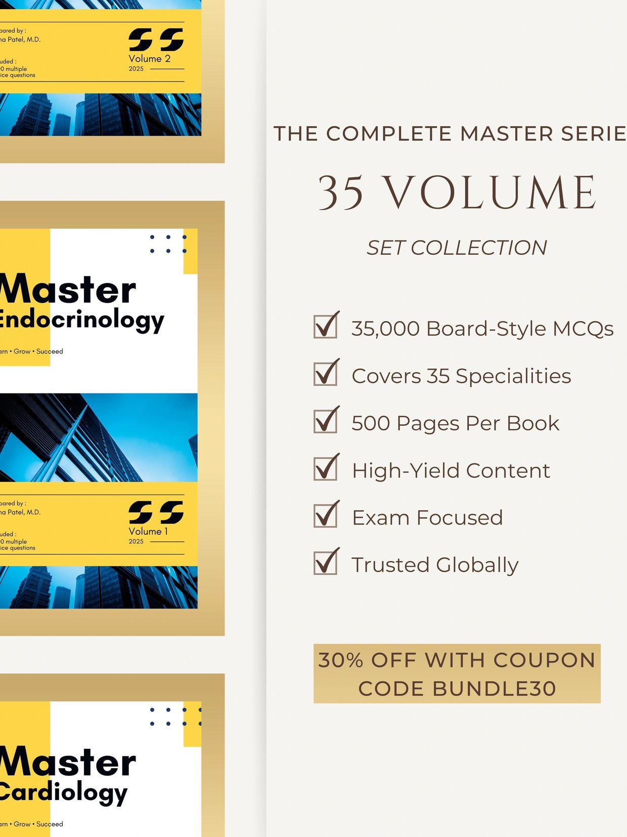 ✔ 1,000 high-yield MCQs per specialty for a total of 35,000 MCQs